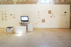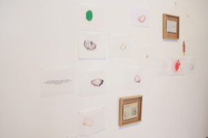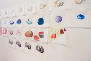 Un deuxième grand mur présentait des dessins de cailloux par thème : abstraits, hyperréalistes, visages, regards… avant de mener à un écran présentant les capsules sonores d’Estelle Coquin.